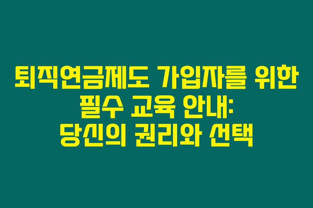 퇴직연금제도 가입자 교육은 필수입니다. 유의하셔야 할 사항과 교육 내용을 잘 기억해 두시고, 이러한 교육이 여러분의 미래를 더욱 밝게 만들어 줄 수 있다는 점을 잊지 마세요. 직장 생활을 하면서 더욱 스마트한 선택을 할 수 있도록 도와줄 것이니까요.