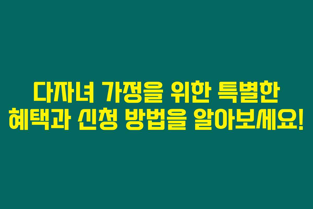 제가 판단하기로는, 다자녀 가정을 위한 각종 혜택과 신청 방법에 대해 알아봤습니다. 다양한 정부의 지원 정책을 통해 경제적 부담을 줄이고 자녀들이 건강하고 행복하게 성장할 수 있도록 도와주는 여러 가지 프로그램이 운영되고 있습니다. 아래를 읽어보시면 다자녀 가정이 누릴 수 있는 혜택에 대한 상세한 내용과 신청 방법을 확인할 수 있어요.