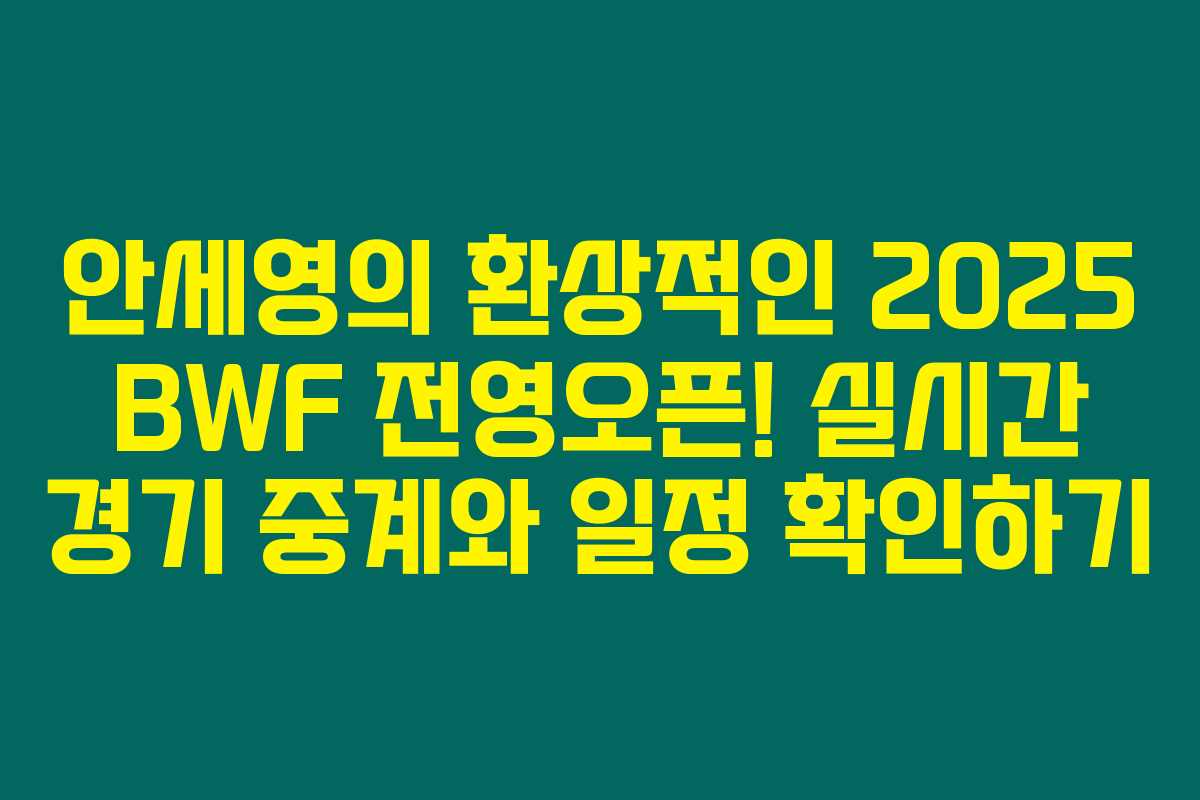 세계적으로 인정받는 여자 배드민턴 스타, 안세영 선수가 기대됩니다. 2025 BWF 전영오픈에서 그녀의 멋진 경기를 놓치지 않기 위해서는 아래를 읽어보시면 실시간 중계 정보와 경기 일정, 더불어 그녀의 흐름을 함께 감상할 수 있는 채널에 대한 안내를 받을 수 있어요!
