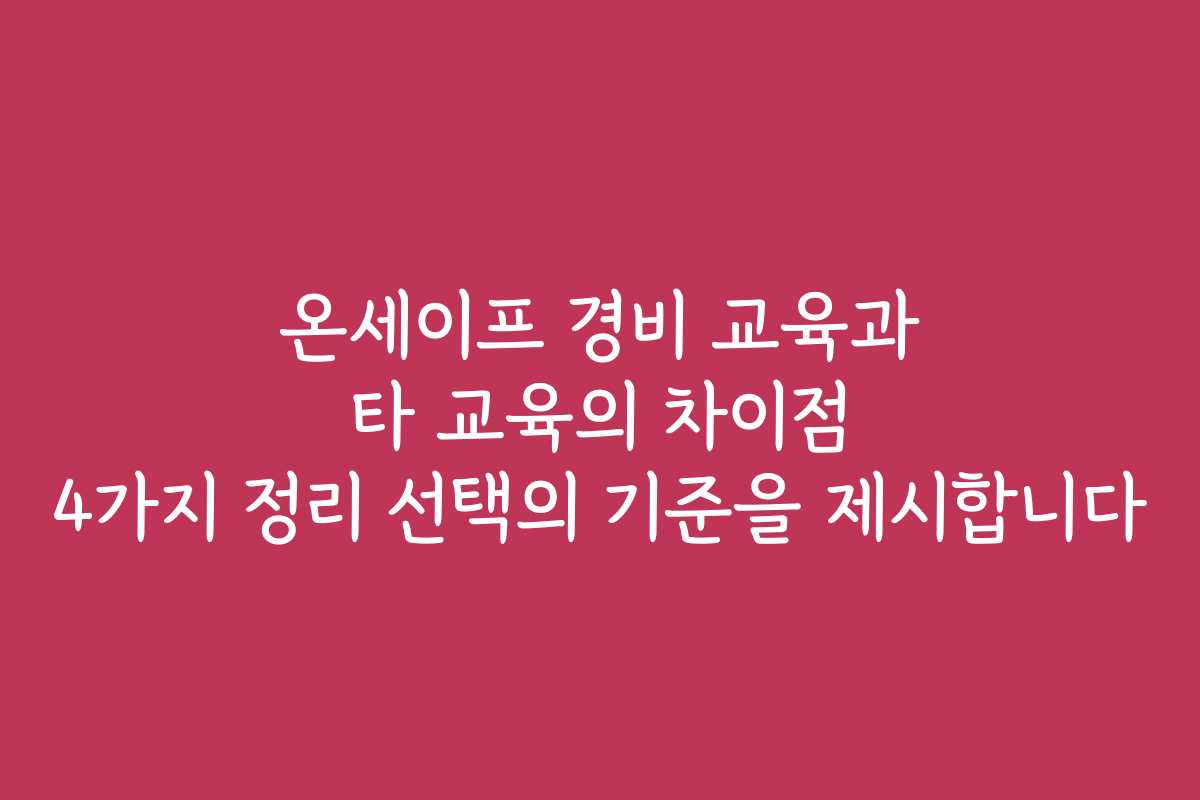 온세이프 경비 교육과 타 교육 간의 차이를 명확히 아시나요? 이 글에서는 경비 교육 선택 시 고민하는 분들을 위해 온세이프 교육과 다른 교육 프로그램의 차이점 4가지를 정리합니다. 이 정보를 통해 최적의 선택을 할 수 있기를 바랍니다.